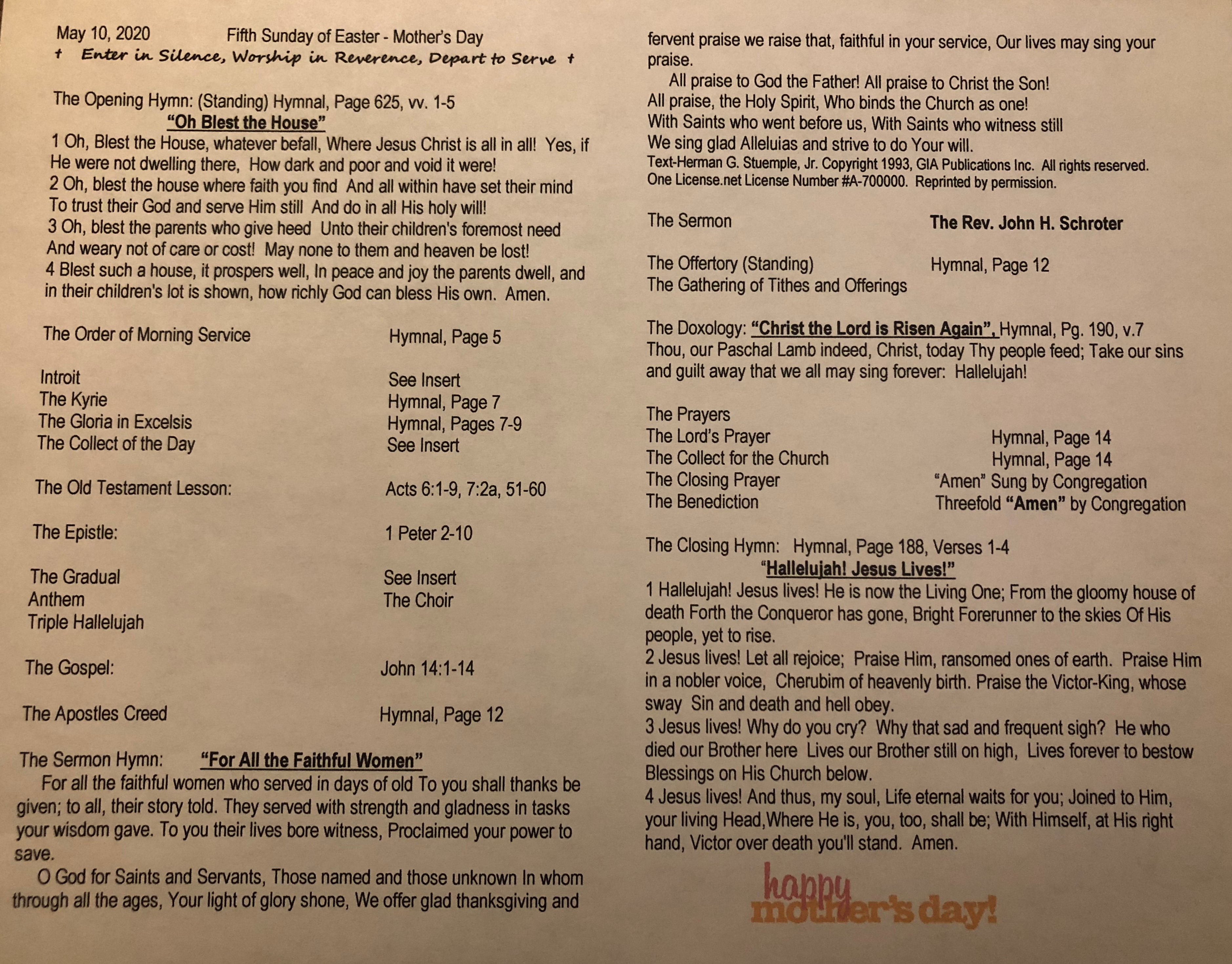 Sunday, May 10, 2020 Mother’s Day Worship Service